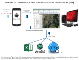 - durch Anschluss des Gerätes mittels USB an den Windows PC und durch Download der Daten durch die CyberTracker Desktop Software (nicht bei iPhone, iPad) -> Szenario Folie 2 oder